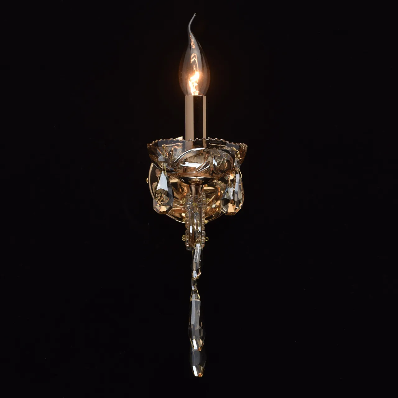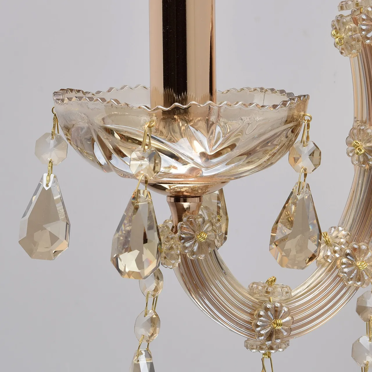 Металлическое основание цвета золота, декоративные элементы из стекла и хрустальные подвески цвета з