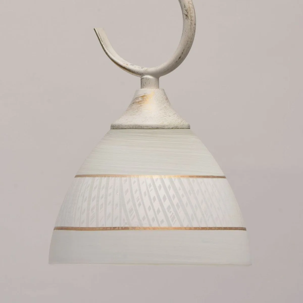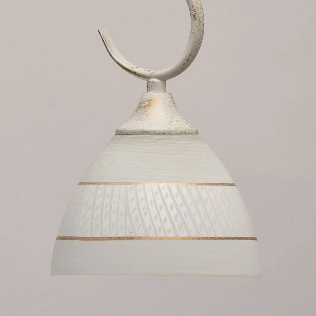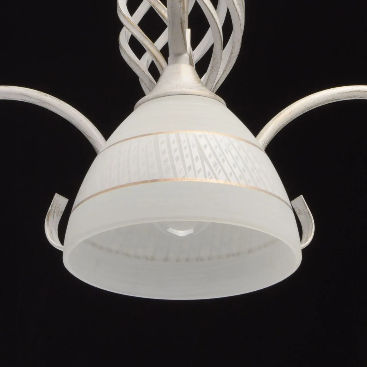 Металлическое основание окрашено в белый цвет с золотой патиной. Плафон: белый стеклянный плафон с