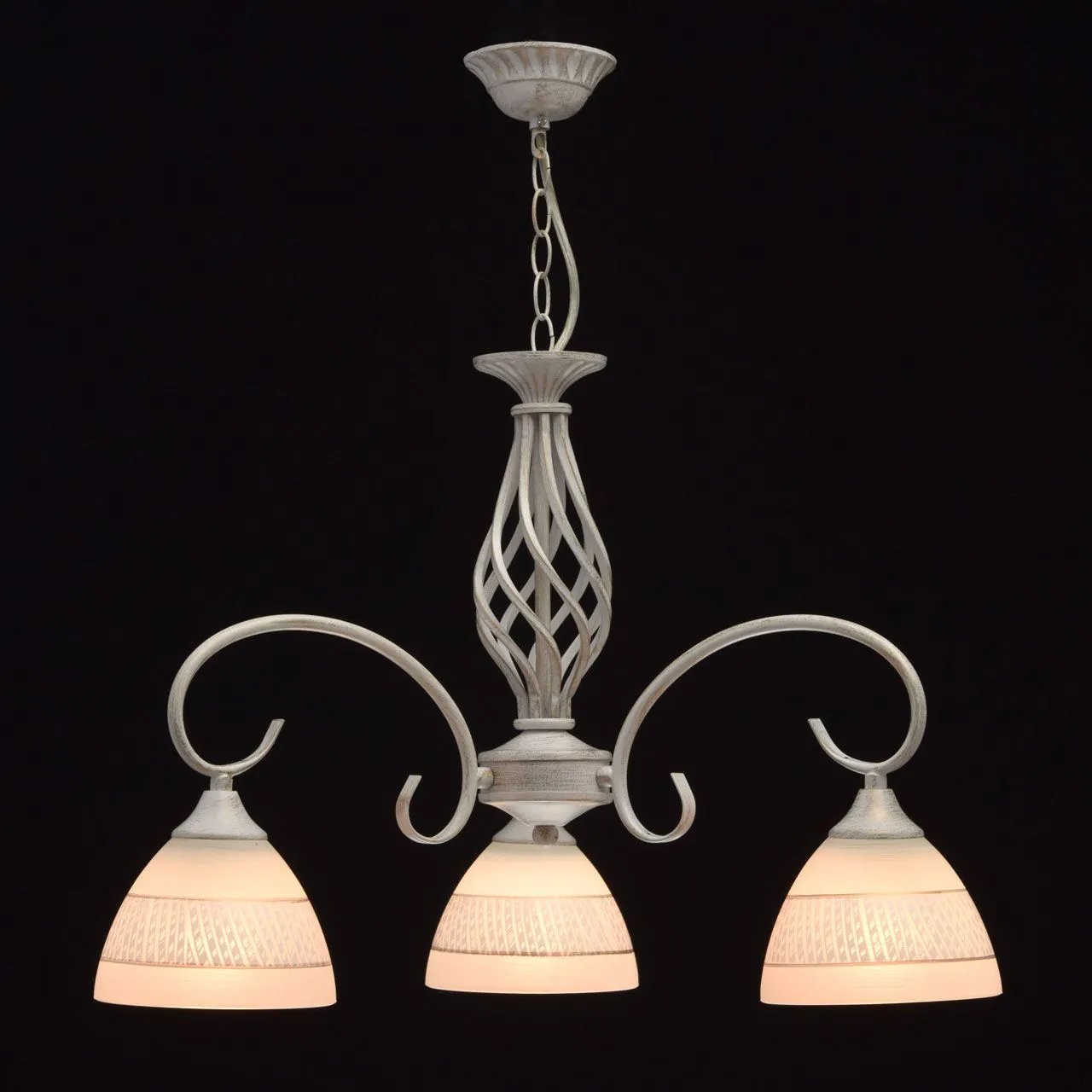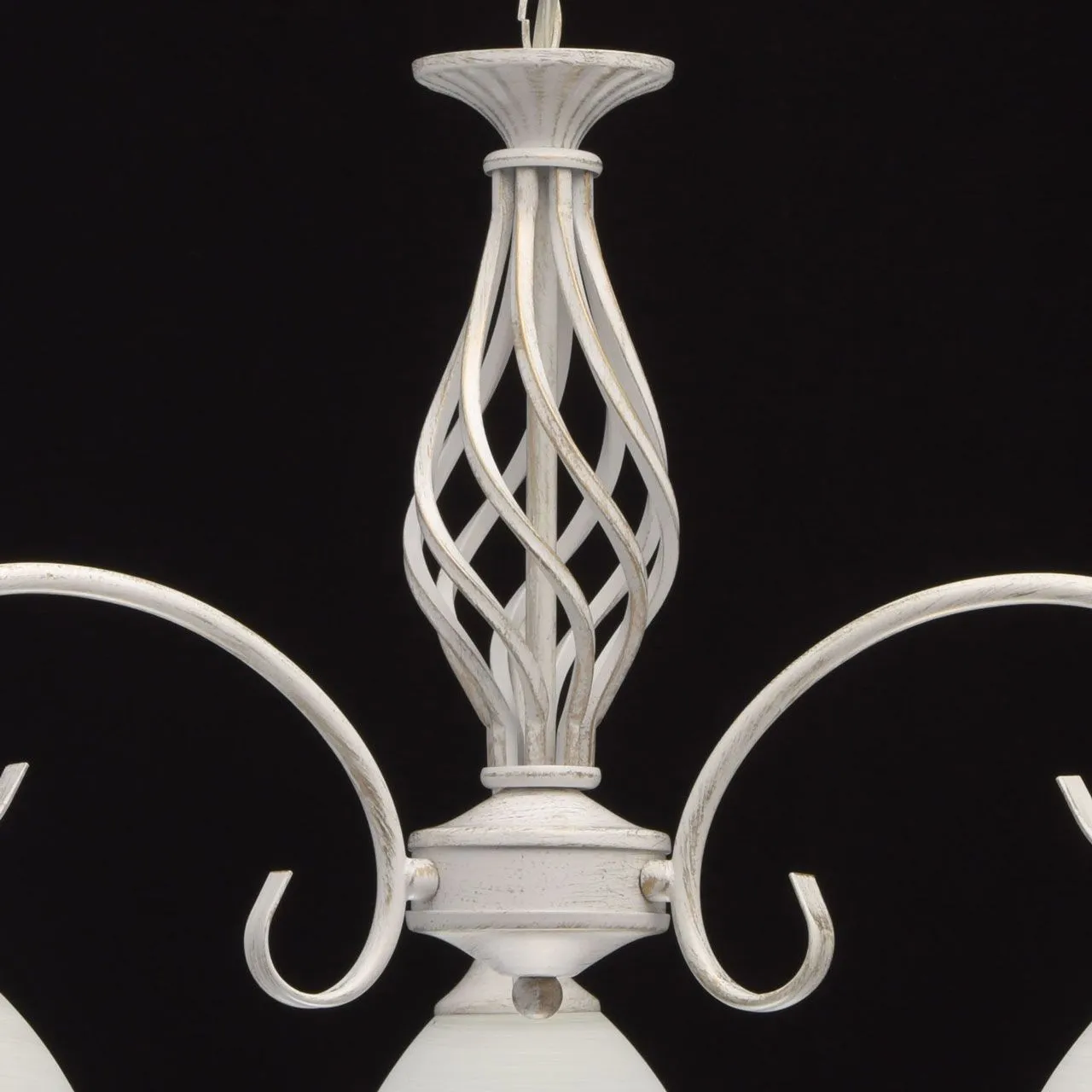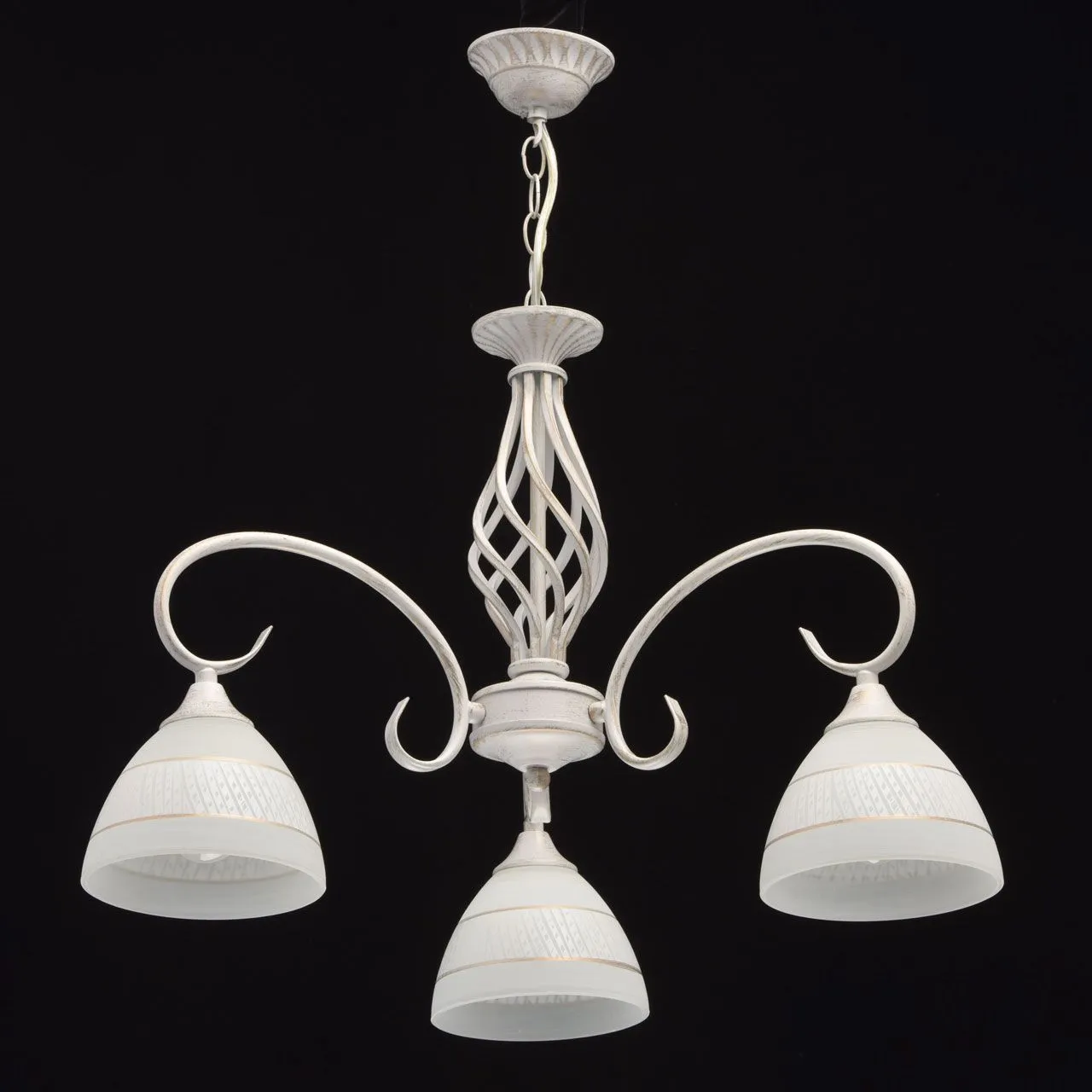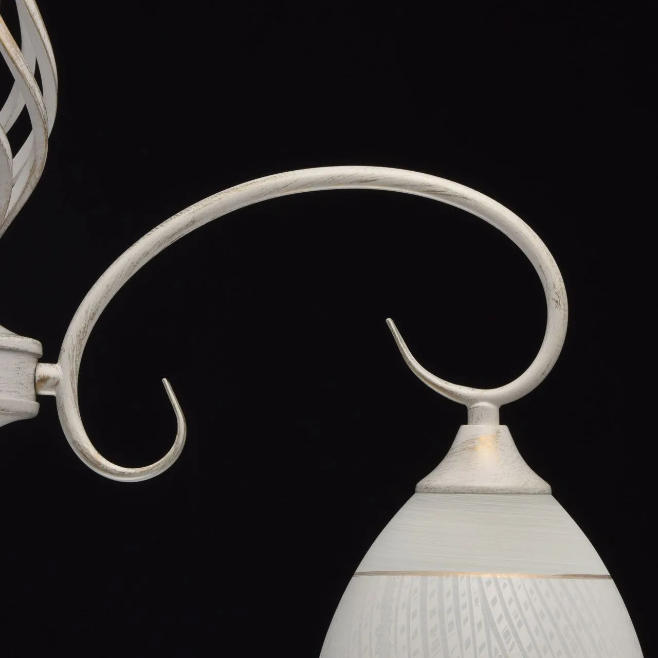 Металлическое основание окрашено в белый цвет с золотой патиной. Плафон: белый стеклянный плафон с