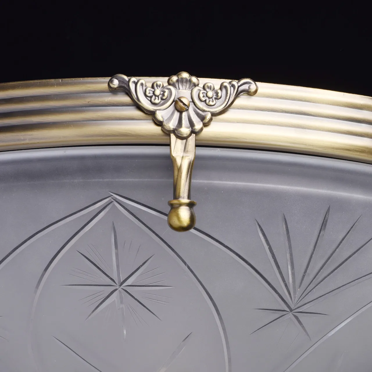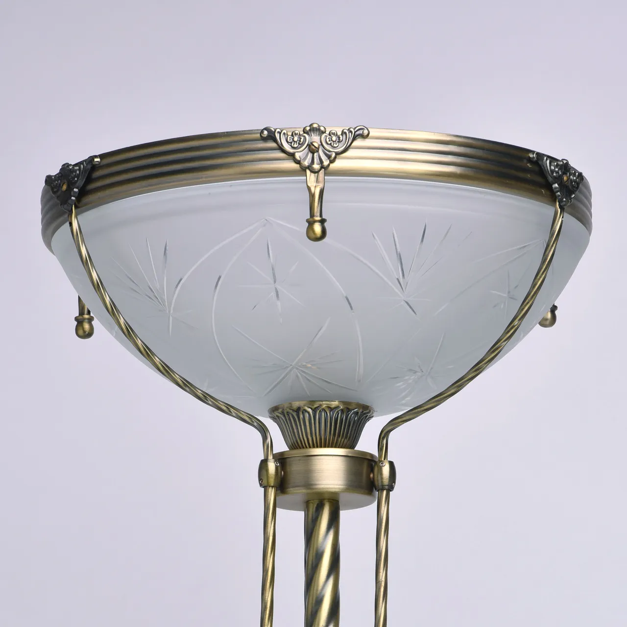 Алюминиевое основание цвета античной бронзы, плафон из матового стекла с резным узором.